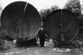 Bernhard Luginbühl mit dem Bernhardiner Xylo vor der Eisenplastik Dolittle, 1970 – 2002, Eisen geschweisst und geschraubt, Elektromotor, 258 × 445 × 136 cm